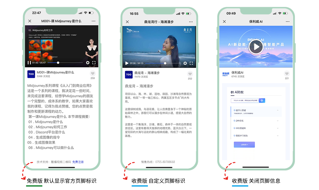 开启或关闭自定义页脚标识:用户可以为二维码观看页面的页脚,设定自定义信息,比如企业名称、企业宣传文案、对应的链接地址。注意,免费版用户默认显示官方页脚标识信息。
